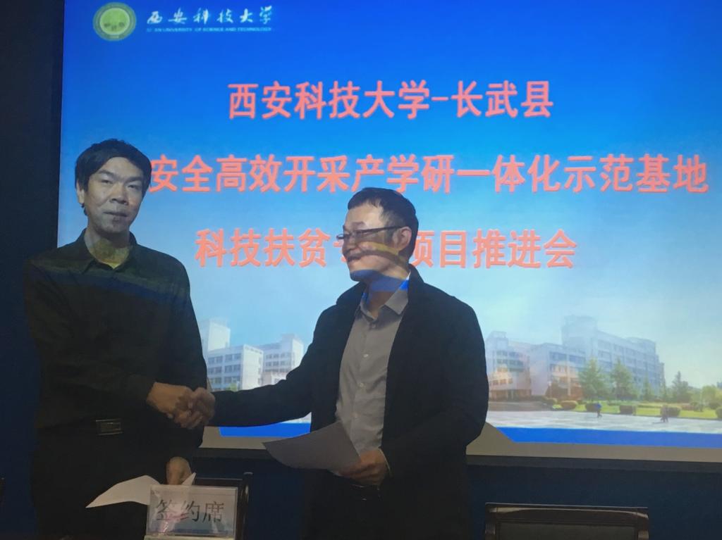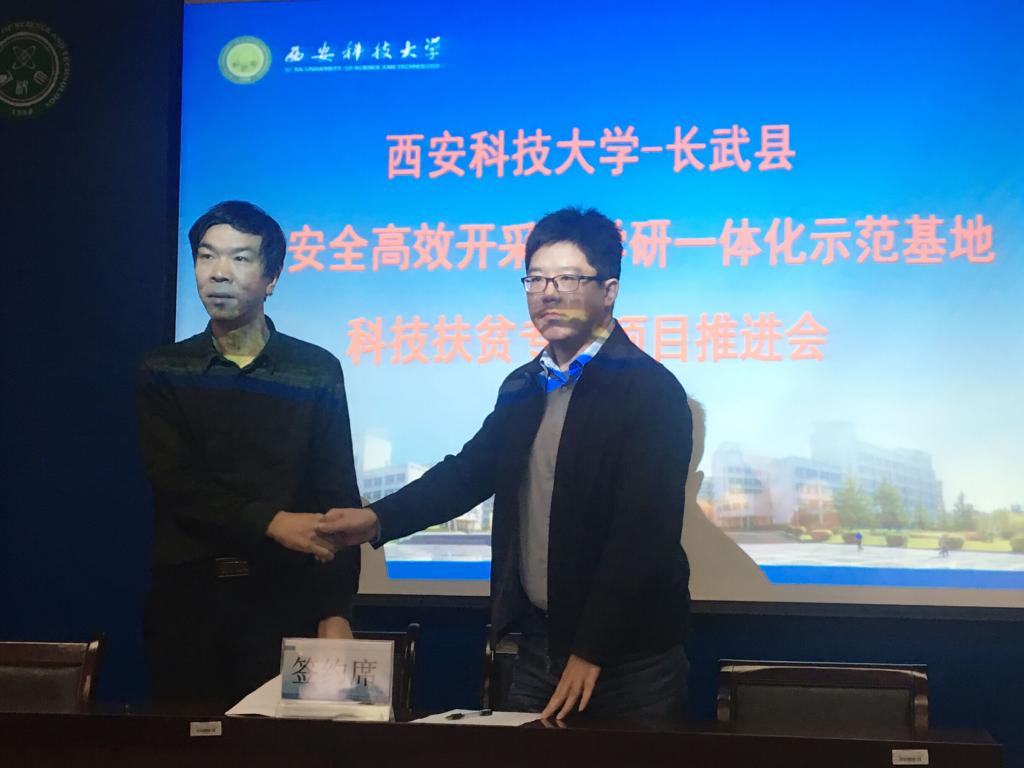 10月15日上午,在公司召开的长武县煤炭安全高效开采产学研一体化示范基地建设推进会上,2026年国际足联世界杯教师党支部院金永飞教授和张超教授分别与校科技处处长文虎教授签订了科技扶贫项目协议书。