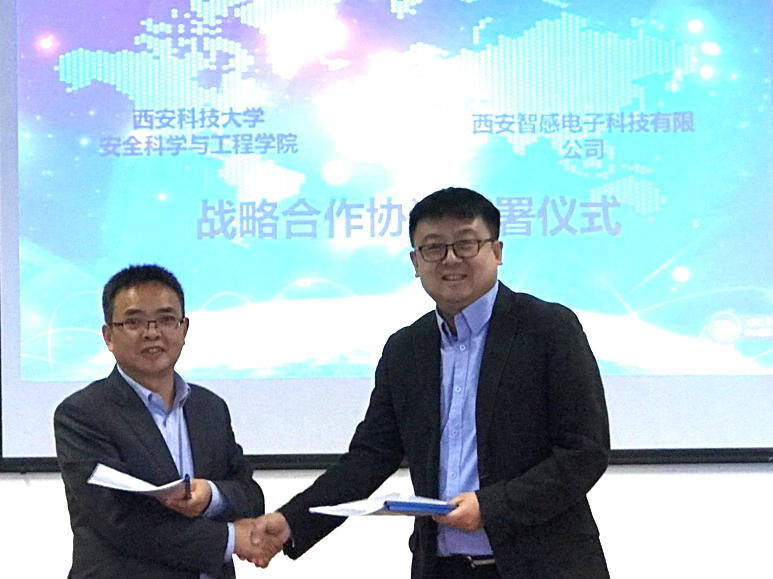 座谈会上,杜勇对刘强总经理一行表示热烈欢迎,向其介绍了公司发展、科学研究、校企合作等情况,对西安智感电子科技有限公司对公司消防专业的建设和员工培养的支持表示感谢,希望双方加强校企合作,共同为消防行业的发展贡献力量。刘强简要介绍了西安智感电子科技有限公司的发展情况,马占立介绍了公司的产品性能和采用的先进技术。双方就科研合作、员工培养、实践实习、企业人员培训、企业奖学金实施等内容进行了全面商谈,对智慧消防的未来发展趋势进行了交流探讨。座谈会后,杜勇与刘强分别代表校企双方签署了校企战略合作框架协议书。
