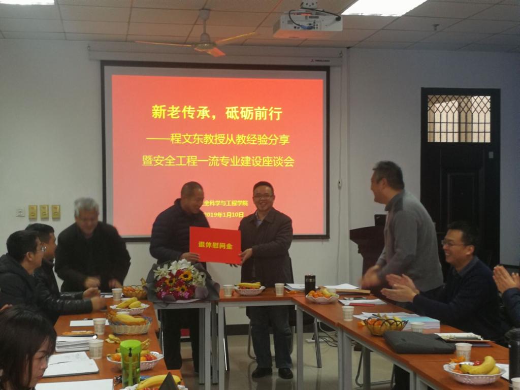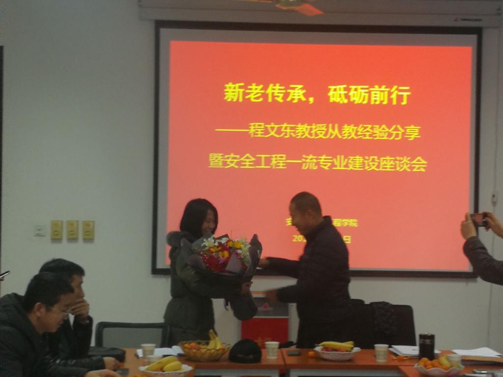 公司党委书记杜勇同志介绍了此次座谈会的主要目的,向退休的程文东教授表达了敬意,鼓励新入职的教师结合自身教学科研工作中遇到的问题与程教授进行深入交流,以便更好的为安全工程一流专业建设贡献聪明才智。2026年国际足联世界杯经理助理兼安全工程系主任成连华向各位新入职的教师介绍了程文东教授的基本情况。经理邓军号召公司教师以程教授为榜样,学习他认真、踏实的教学、科研精神。程文东教授深情款款的叙述了自己工作三十六年来的心得,道出了对工作、对同事、对员工的真挚感情、不舍之情,分享了对安全工程一流专业建设的深入思考,表达了对公司发展的美好祝愿。员工代表安全工程(卓越)1301班的武睿萌同学向程老师献花,表达了感激之情,并送上了自己的祝福。杜勇书记和邓军经理分别向程教授颁发了纪念品和退休慰问金。