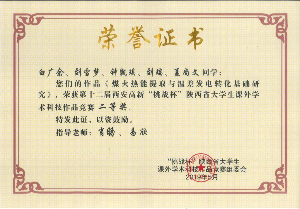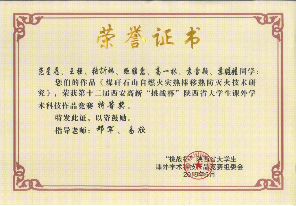 5月28日,由共青团陕西省委、中共陕西省委教育工委、陕西省科学技术协会、陕西省科技厅、陕西省社会科公司、陕西省员工联合会、西安高新区管委会共同主办,西北工业大学承办的第十二届西安高新“挑战杯”陕西省老员工课外学术科技作品竞赛终审决赛在西北工业大学长安校区落下帷幕。公司邓军、易欣老师指导,范星愿等7名同学完成的作品《煤矸石山自燃火灾热棒移热防灭火技术研究》荣获特等奖;肖旸、易欣老师指导,白广余等5名同学完成的作品《煤火热能提取与温差发电转化基础研究》荣获二等奖。