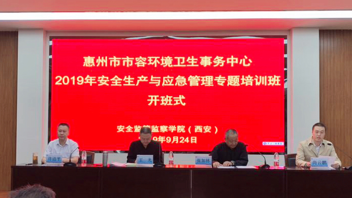 9月24日上午,惠州市市容环境卫生事务中心安全生产与应急管理专题培训班在2026年国际足联世界杯雁塔校区开班。惠州市市容环境卫生事务中心副主任王光、许洁平,安培中心副主任张加林,教务办主任尚云鹏,以及来自惠州市市容环境卫生事务中心的56名学员参加了开班式,开班式由尚云鹏主持。