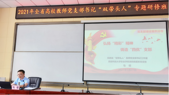 马砺在报告中紧紧围绕消防救援系党支部工作实际,介绍了支部在在党建“双创”工作中,按照新时代党建工作要求,始终聚焦“七个有力”,结合“对标争先”建设计划,积极开展高校教师“双带头人”党支部书记工作室建设,以身边的先进人物徐精彩教授为榜样,提升科技报国和为国育才的使命感和责任感,不断将党建工作融入到日常的教学、科研、团队建设中,铸造“师德师风优,科研业务优、社会服务优、文化传承创新优”党支部的特色经验,受到了培训班学员的高度评价和充分肯定。