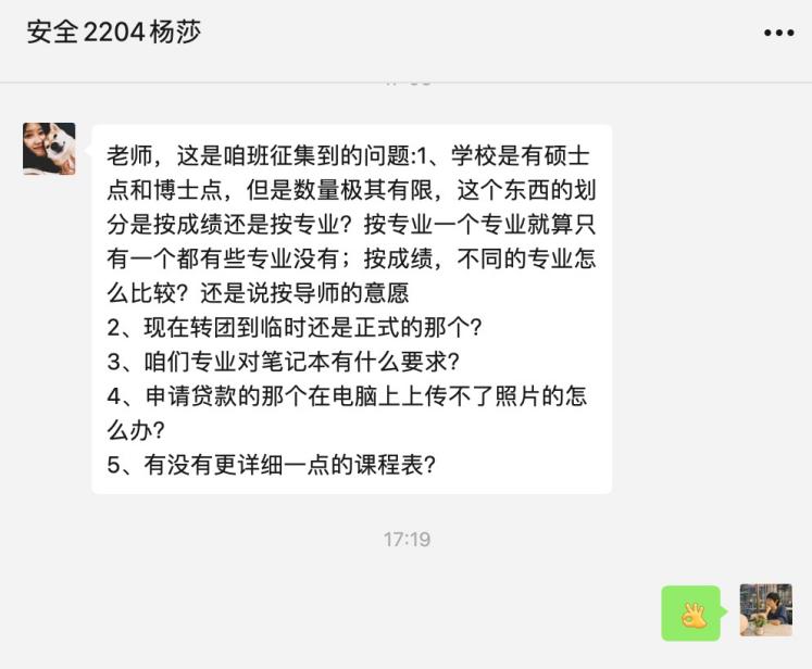 会上,王倩就公司调整开学时间的通知进行了强调,对疫情防控形势、入学报到手续等方面进行了说明,并就会前征集的同学们普遍关心的团组织关系转接、档案邮寄、学费缴纳、资助政策、宿舍管理等方面的问题进行了逐一解答。