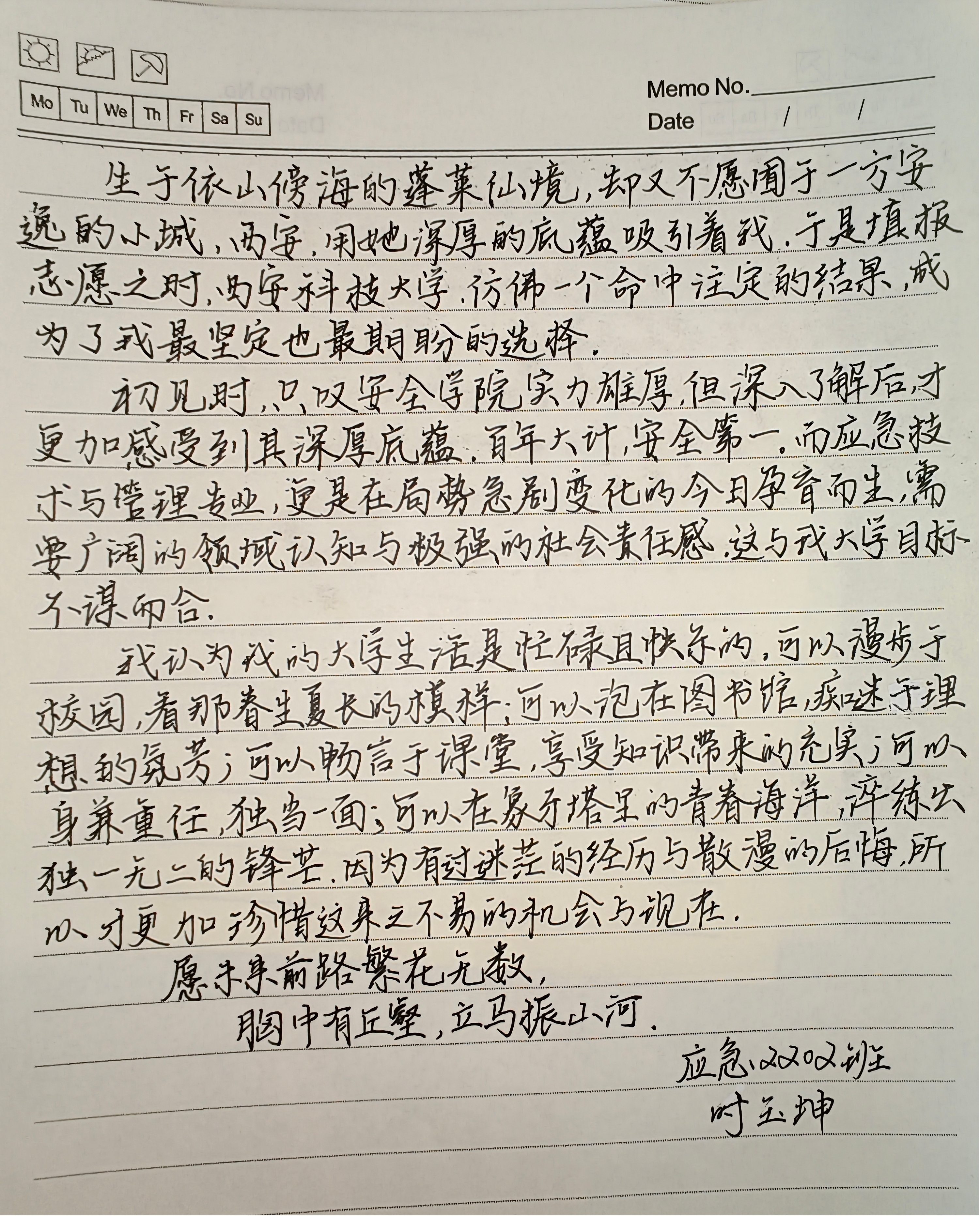 十八岁少年的眼中总是燃烧着青春的炽热火焰,心中怀揣着对未来的无限期待。曾无数次幻想过散步在日落的操场;和舍友们在宿舍谈天说地;在图书馆里手不释卷......我始终坚信“靠努力获得的才属于自己”哪怕是脱离父母羽翼的庇护,突破舒适圈的束缚选择“远走他乡”,在新的环境中创造一个更新更好更优秀自己。也正是这样坚定的想法让我选择了消防工程,或许不少人不理解这个做法,可是安全是万事的核心与基础,如果没有人愿意去接触这项专业,又有谁能保证安全的实施?当我们抬头看时,总是觉得星星很遥远,可其实我们自己就是星星本身,希望我们能够用自己的光芒照耀未来的迷茫。