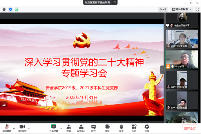 10月31日下午,2019级、2021级本科生党支部通过腾讯会议线上召开党员大会,专题学习党的二十大精神会。会议由党支部书记袁刚主持。公司党委书记刘文刚应邀参加会议。支部成员公司团委书记周学刚、2021级员工辅导员段思颖和全体员工党员参加了会议。
