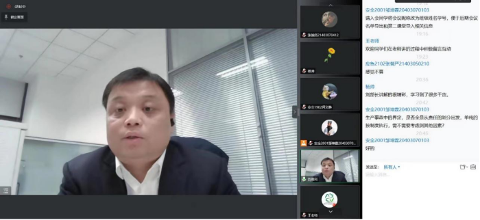 在互动问答环节,刘晓利结合自己多年的工作经验,就员工普遍关心的职业责任承担界定问题、如何处理事故善后问题、如何提升素质能力等问题,分享了个人的认识和观点,帮助同学们更加清楚地了解毕业后从事安全管理工作时解决问题的方法步骤,鼓舞同学们作为安全管理人员要坚持原则,树立安全责任感,锤炼底线思维和红线意识,不断提高防范化解重大安全风险的能力和水平。
