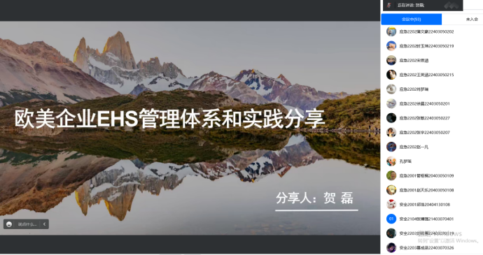 贺磊以《欧美企业EHS管理体系和实践分享》为题,结合多年从事EHS工作、企业安全文化建设的经验,通过讲解外企EHS管理体系构架、外企EHS管理和优秀实践案例、EHS 文化建设和外企EHS的人员需要具备的能力等方面与同学们进行探讨,增加了同学们对安全工程专业学子在今后从事有关外企工作方面的了解以及在未来工作中构建EHS体系的基础知识,有着很好的启发作用。
