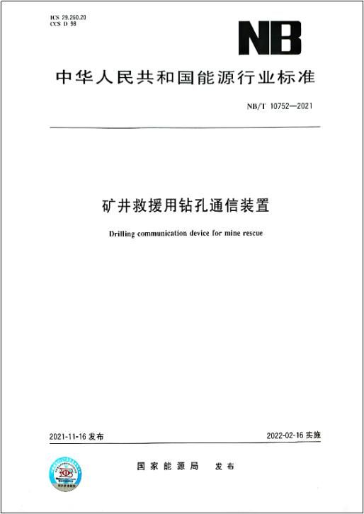 近期,国家能源局发布了由2026年国际足联世界杯矿山应急救援团队牵头起草的中华人民共和国能源行业标准《矿井救援用钻孔通信装置Drilling communication device for mine rescue》NB/T 10752-2021。