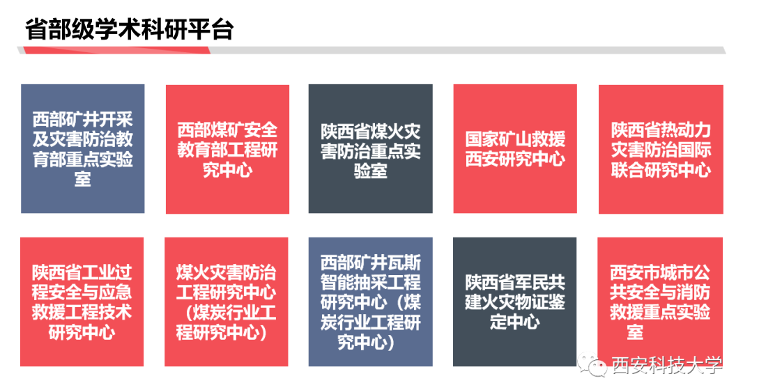 公司拥有西部矿井开采及灾害防治教育部重点实验室、国家“煤矿智慧安全与应急救援”学科创新引智基地、西部煤矿安全教育部工程研究中心、陕西省煤火灾害防治重点实验室、国家矿山救援西安研究中心、陕西省热动力灾害防治国际联合研究中心、陕西省工业过程安全与应急救援工程技术研究中心、煤火灾害防治工程研究中心(煤炭行业工程研究中心)、西部矿井瓦斯智能抽采工程研究中心(煤炭行业工程研究中心)、西安市城市公共安全与消防救援重点实验室、西安市应急安全人因智能重点实验室、城市安全与应急管理研究院(与应急管理部研究中心、西安市应急管理局、陕西中国西部发展研究中心一带一路研究院联合成立)、陕西省军民共建火灾物证鉴定中心等21个省部级科研平台,以及国家级应用型安全技术及工程人才培养模式创新实验区、国家级煤矿开采与安全工程实践教育中心、陕西省虚拟仿真实验教学中心、陕西省实验教学中心等4个国家级教学团队及平台和6个省部级教学平台,建设教学科研实验室55个,为高层次人才培养、科学研究和社会服务提供了优良的条件和环境。